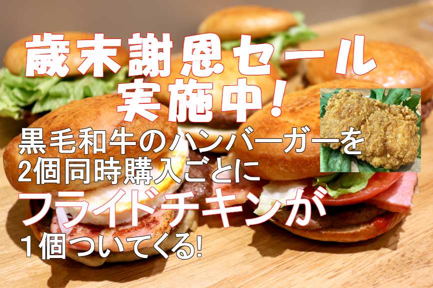 - 歳末謝恩セール実施中!黒毛和牛のハンバーガーを2個同時に購入ごとにフライドチキン1ピースプレゼントします。12月末日まで